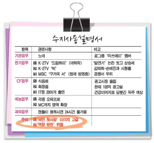 그렇다면 만약 요즘 대세돌인 수지의 사용설명서가 있다면, 인기 대세기인 요즘엔 어떤 내용이 담겨져 있을까. 또 이후에도 최선의 손익계산서를 얻기 위해, 설명서 수정 조항을 넣는다면 무엇이 들어가야할까. '국민 첫사랑' 수지의 근무 형태를 규정한 '수지 사용설명서' 항목 속으로 들어가보자.