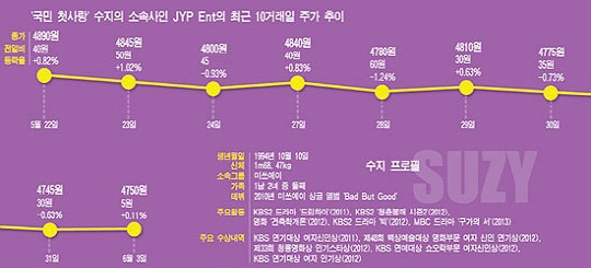 물론 수지 때문만은 아니겠으나, 걸그룹으로서 미쓰에이에 대한 기대감이 상승기조라고 말하긴 어렵다. 행사의 계절인 5월과 6월, 수지의 드라마 촬영 때문에 미쓰에이의 단체 활동이 사실상 불가능했던 점 또한 소속사 전체의 수익적 차원에선 고려해봐야 할 대목. 물론 수지를 개별활동시키는게 지금 당장은 '실보다 득'이 크겠지만, 장기적인 차원에서 보면 보다 복잡한 셈법을 동원해봐야할 때다.